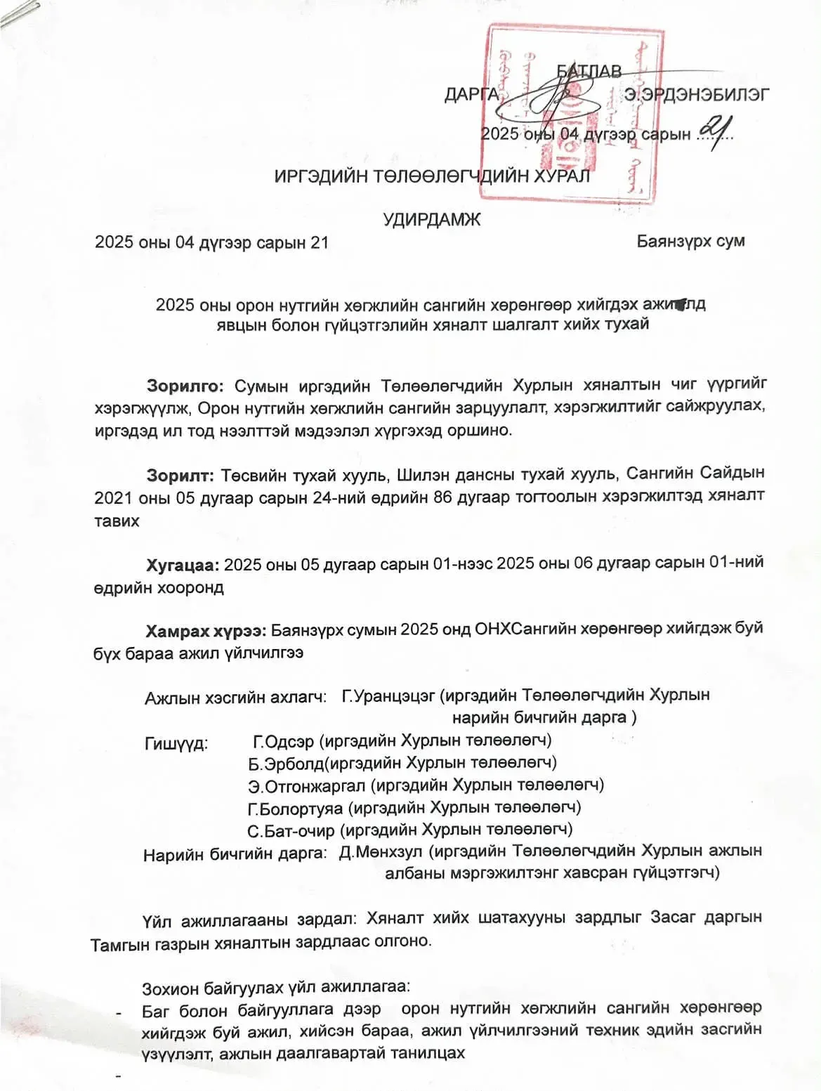 БАЯНЗҮРХ СУМЫН ИРГЭДИЙН ТӨЛӨӨЛӨГЧДИЙН ХУРЛЫН АЖЛЫН АЛБАНЫ МЭДЭЭ МЭДЭЭЛЭЛ